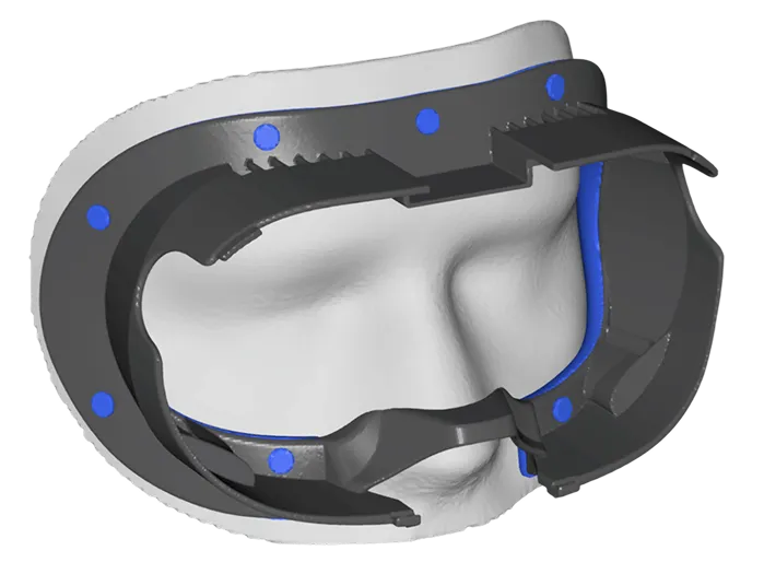 Your frame is generated from your scan and optimized for pressure distribution, correct eye alignment, and field of view. The appropriate padding size is selected based on your facial geometry.